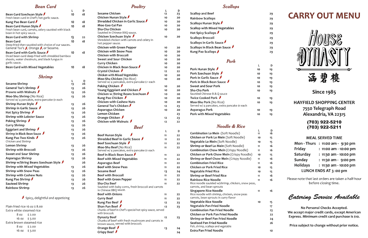 Welcome to House of Dynasty, a gem nestled in the heart of Alexandria, VA, that promises a delightful journey into the rich world of Chinese cuisine. Located conveniently at 7550 Telegraph Rd, this restaurant skillfully blends traditional flavors with a welcoming atmosphere that makes it a beloved spot for both locals and visitors alike.